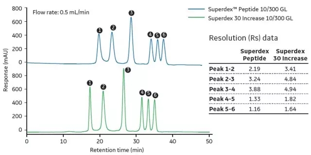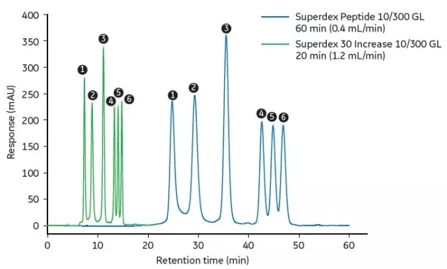 • Compared to the original Superdex Peptide, Superdex 30 Increase has a higher flow rate and saves ÄKTA when the resolution is constant.