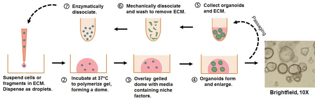 嵌入式3D“穹頂”類(lèi)器官培養工作流程。單個(gè)細胞或類(lèi)器官片段嵌入液體細胞外基質(zhì)(ECM)中,并作為小液滴分配到預熱的組織培養塑料容器的表面上。在37°C下培養后,ECM將固化為一個(gè)整體,形成“穹頂”凝膠,然后可用培養基覆蓋。類(lèi)器官將在穹頂內形成3D結構。