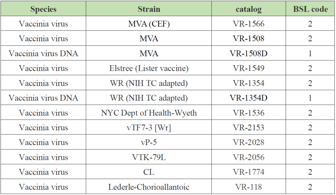 隨著(zhù)猴痘病毒重新出現在公眾視線(xiàn)中,猴痘相關(guān)的各種研究材料也成為急需產(chǎn)品。ATCC作為全球范圍的生物資源收藏中心,收藏有與猴痘病毒研究相關(guān)的一些資源,我們做了如下整理。受美國出口管理條例管控ATCC無(wú)法出口猴痘病毒,與其同為正痘病毒屬的痘苗病毒可以作為疾病鑒別診斷和研究疫苗等的基礎材料。