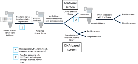 對于某些文庫,質(zhì)粒DNA可以直接遞送到細胞內。而其他的,特別是集合慢病毒質(zhì)粒的文庫,必須先用于制造病毒。隨后,用這種混合病毒將質(zhì)粒運送到靶細胞。無(wú)論什么情況,都建議對大規模制備的 DNA進(jìn)行二代測序,以驗證文庫的完整性。不完整的文庫可能導致在以后的實(shí)驗中出現假陽(yáng)性或假陰性,并可能對數據的重現性產(chǎn)生負面影響。
