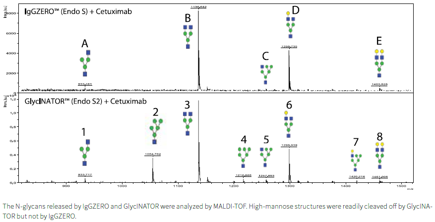 為了比較IgGZERO和GlycINATOR對N-聚糖的特異性,分別用這兩種酶對西妥昔單抗進(jìn)行去糖基化??贵w去糖基化后,用FabRIC ATOR水解為F(ab ’)2和Fc片段。西妥昔單抗含有高甘露糖型聚糖。