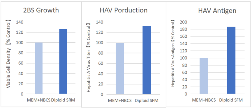 目前我們已經(jīng)證實(shí)了二倍體培養基成功用于水痘、水皰性口炎病毒,麻腮風(fēng),腸道病毒和甲肝等,并且效價(jià)不低于傳統的培養基 ,在某些案例上要高于傳統培養基1個(gè)Log值。